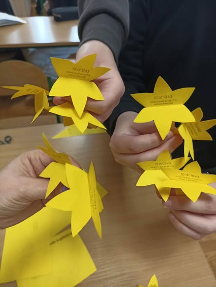 Uczniowie naszej szkoły przygotowali papierowe żonkile, które stały się symbolem naszej pamięci o bohaterach powstania w getcie warszawskim.